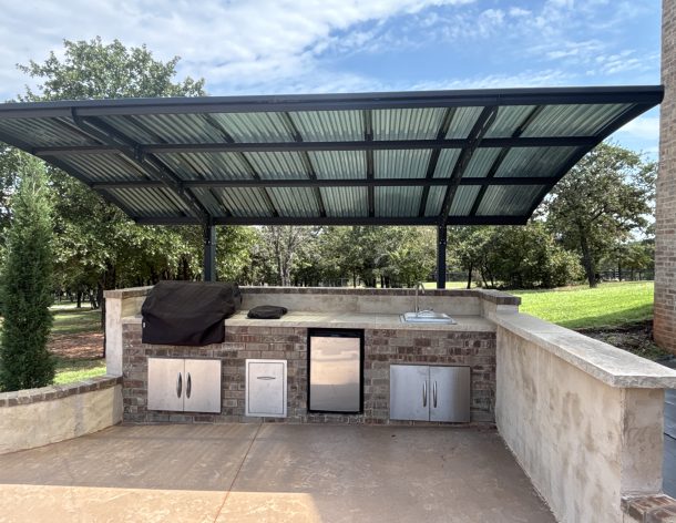 Looks great. We bought a carport that we knew would be a perfect 2 legged awning for our outside kitchen. Large enough to cover the entire kitchen yet only 2 legs that do not get in the way. We are pleased with the quality and it has been up for over a year in all kinds of rough weather conditions...On time delivery