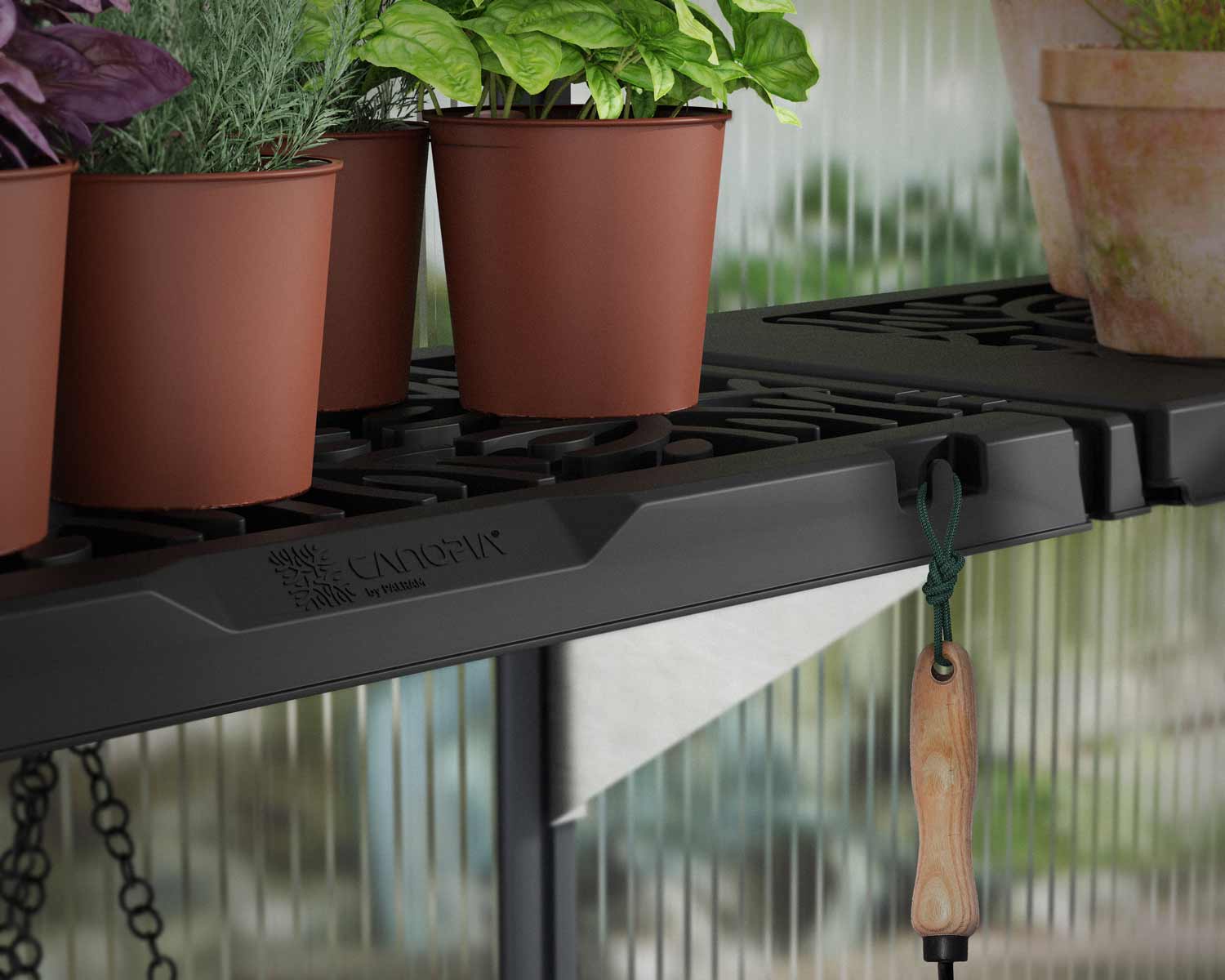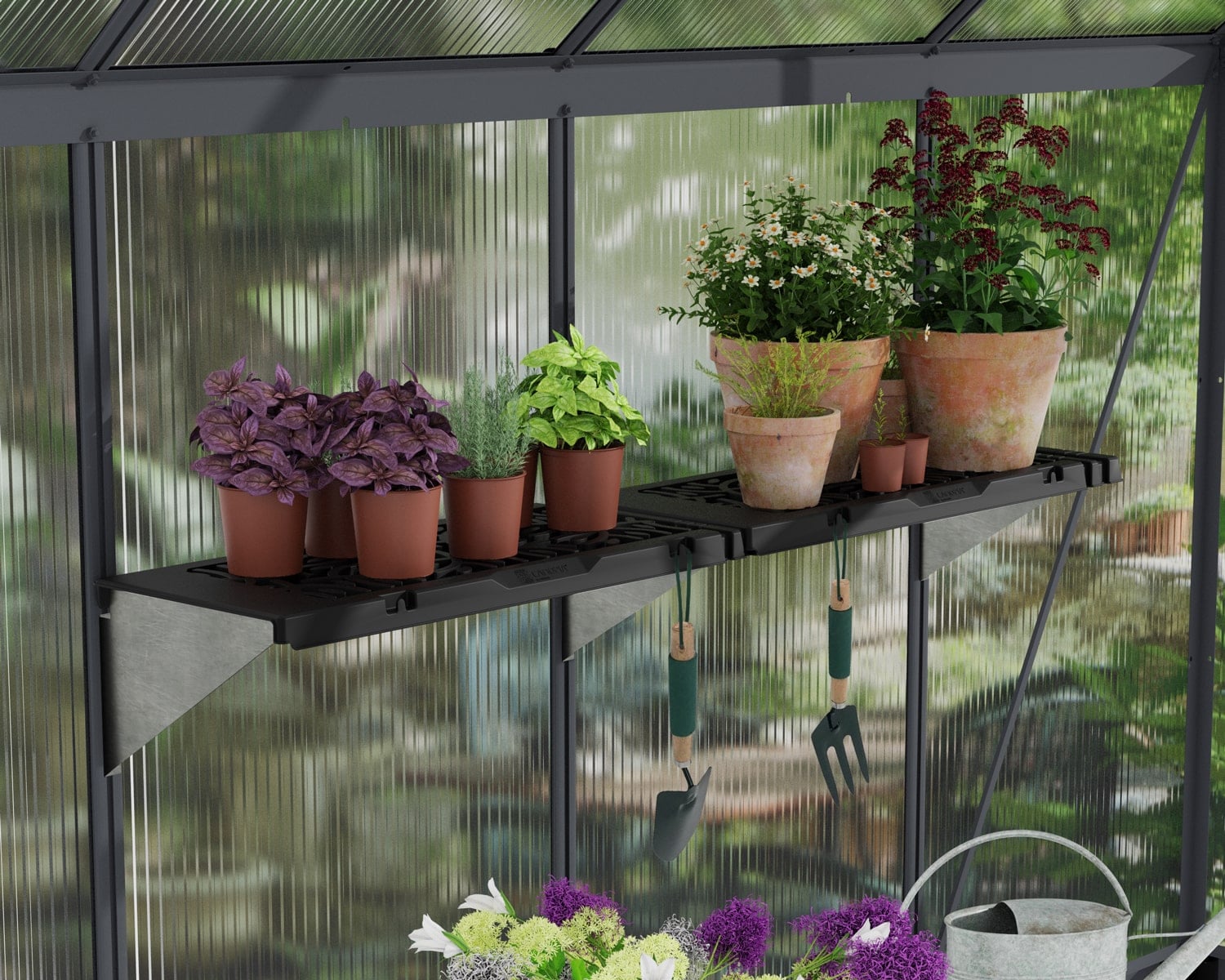 Accessorize your Palram - Canopia greenhouse with this shelf kit to make your nursery as functional as possible. Constructed with durable polypropylene plastic that incorporates the beautiful Canopia logo, each shelf can support up to 44 lbs / 20 kg and comes with the brackets and fasteners needed to easily mount onto your greenhouse wall or corner. The Canopia greenhouse shelves come with drainage holes to hose down any excess plant, soil, and water remnants that collect and each one has two notches to hold gardening tools as well as grooves underneath to easily connect Canopia plant hangers (sold separately). Create more space and organization in your greenhouse with the Palram – Canopia Shelf Kit!