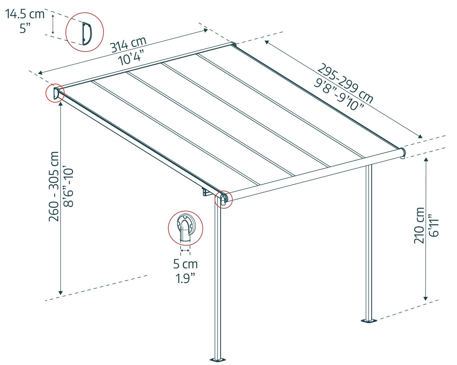The Capri is a high performance structure, with flexible positioning poles enabling you to set your required height at the wall connection, the distance from the house and between the poles at the front. Wall mounting plate is adjustable to meet your desired height between 260-305 cm (101.2 in. 120 in.); allowing a flexible positioning of the roof slope enabling snow and rain to slide off (A) Adjustable oval poles allow for ideal positioning: left to right 0-54 cm (0 in. 21.2 in.) and front to back 226-286 cm (89 in. 112.6 in.) (B + C)FAQ