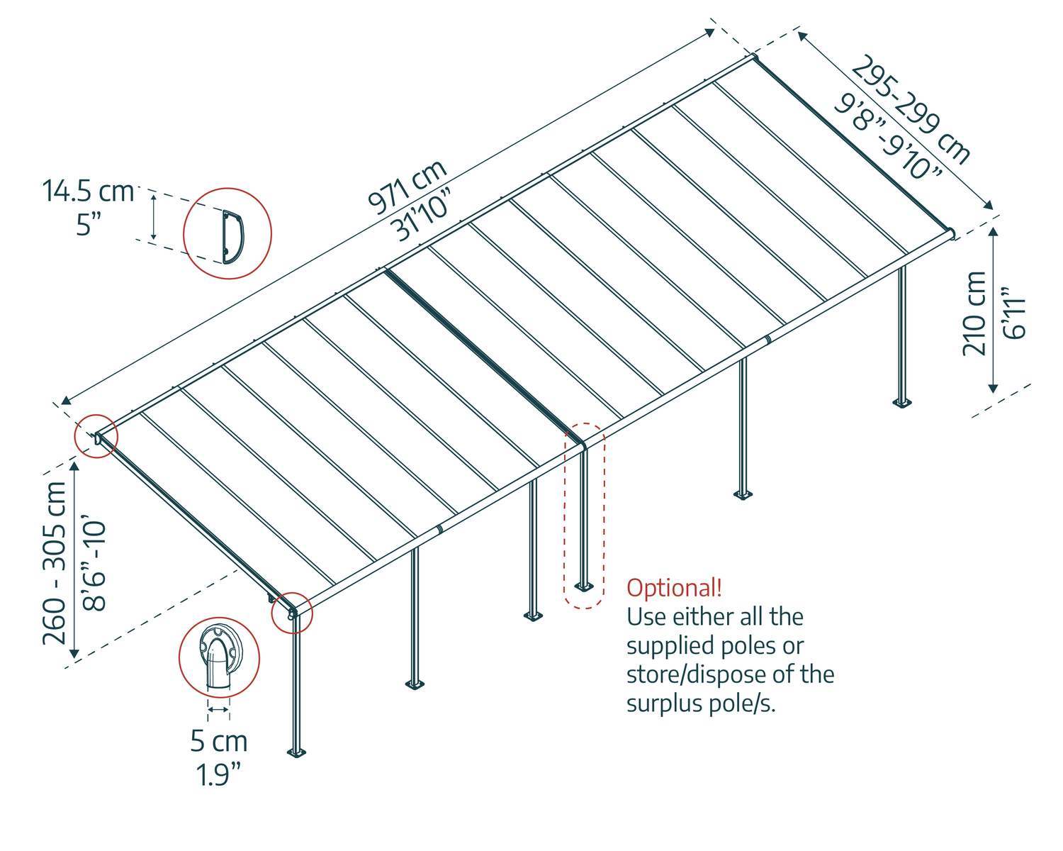 The Capri is a high performance structure, with flexible positioning poles enabling you to set your required height at the wall connection, the distance from the house and between the poles at the front. Wall mounting plate is adjustable to meet your desired height between 260-305 cm (101.2 in. 120 in.); allowing a flexible positioning of the roof slope enabling snow and rain to slide off (A) Adjustable oval poles allow for ideal positioning: left to right 0-54 cm (0 in. 21.2 in.) and front to back 226-286 cm (89 in. 112.6 in.) (B + C)FAQ