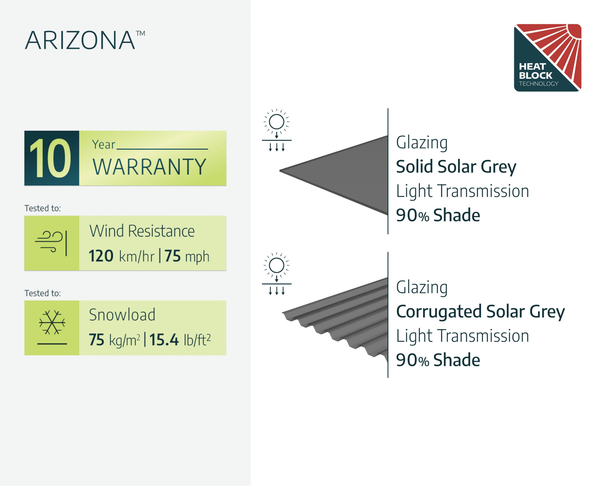 Sophistication meets practicality with the Arizona Double Carport, crafted to meet your needs for outdoor protection. Its two-legged form makes it easy to access and works just as well as a patio cover, offering shade and protection no matter how you use it. The unique wing carport design makes a statement whether you build it facing inward or outward. The frame and roofing were engineered to withstand harsh weather conditions with polycarbonate panels that block harmful UV rays and an aluminum frame built to last. The Arizona double slope carport kit provides your family with an elegant cover that is sturdy, weather and rust-resistant, and maintenance-free for many years to come.