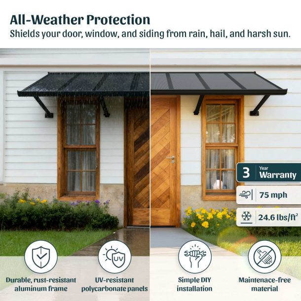 - All-Weather Protection – Shields your door, window, or air cooler from rain, snow, hail, and harsh sun. Tested to withstand winds up to 75 mph and snow loads of 24.6 lb/ft².
