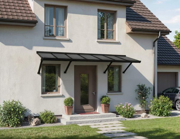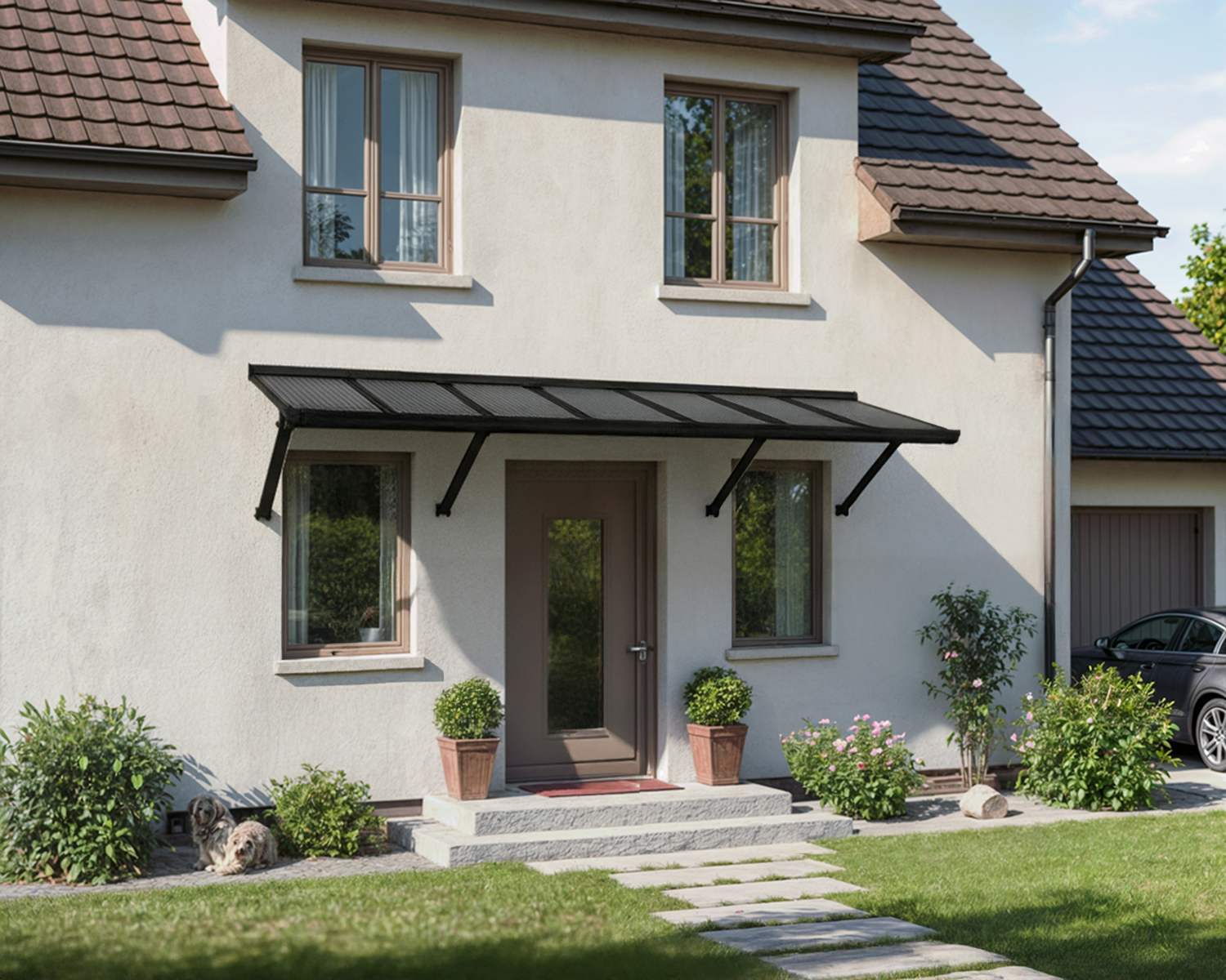 The Canopia Augustine Door Awning combines modern elegance with everyday strength to protect your home’s entrance. Its bold black aluminum frame, opaque gray twin-wall panels, and precision-engineered supports, deliver reliable year-round performance while enhancing curb appeal.