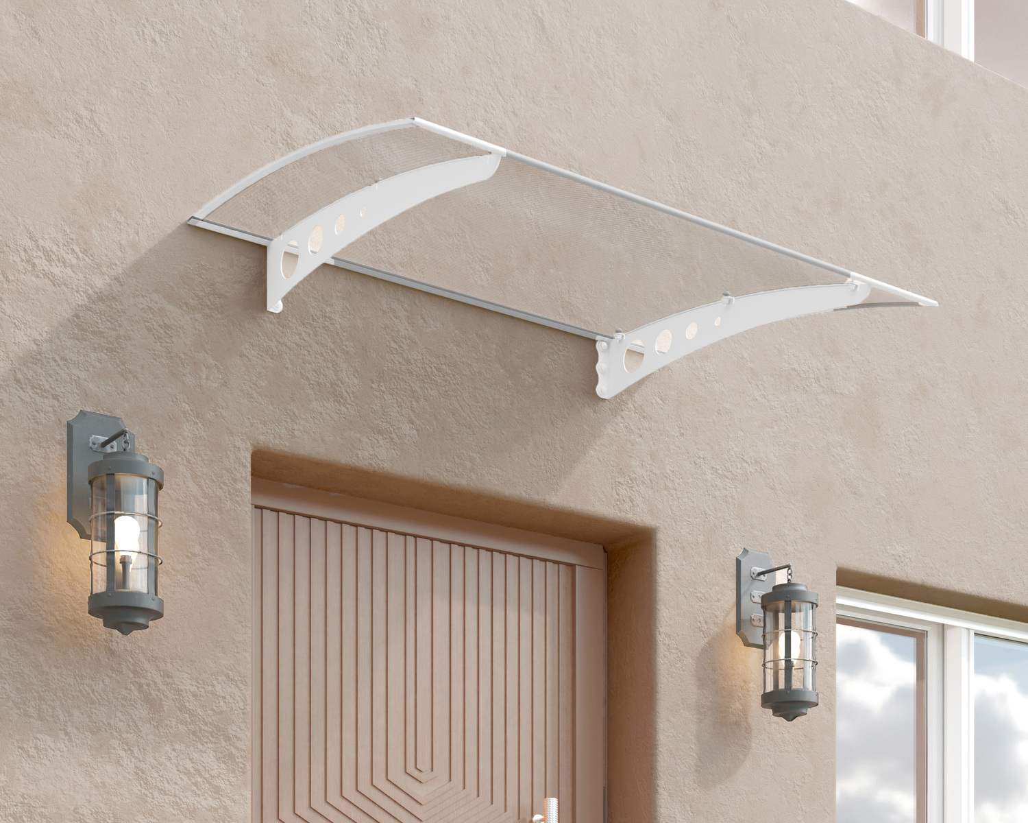 Provide protection from the sun, guard against elements like rain and snow, and add a little something over those bare windows with the Lyra Door Awning. With a white frame and clear polycarbonate panels, this Door Cover makes a first great impression for your home and is designed to last. With 80% light transmission, the Lyra shields the front of your home without darkening the entry and while blocking 100% of harmful UV rays. This Front Door Awning is maintenance-free, easy to assemble, and leak-free! Get your Door Canopy today and start protecting your entry today!
