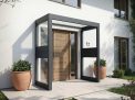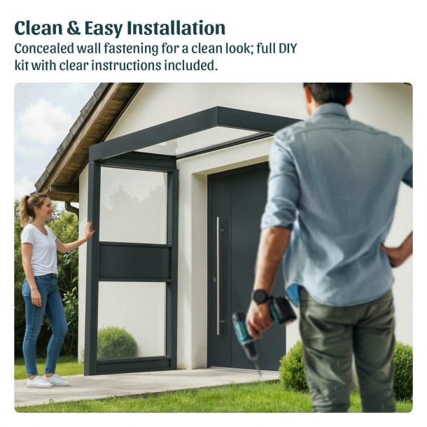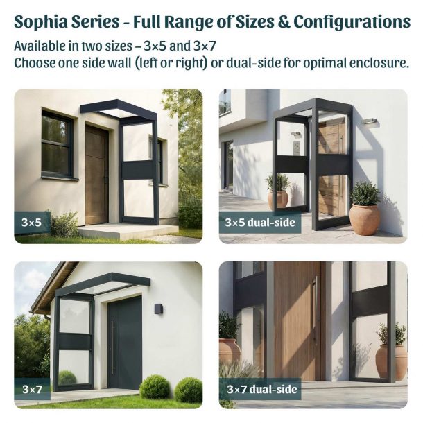 Add contemporary style and protection with the Sophia Door Awning and Sidewall. Upgrade your entryway with the Sophia Sidewall, the perfect complement to the Canopia Sophia Door Awning. Designed exclusively for use with Sophia awnings, these integrated side wall panels provide added protection, modern style, and a welcoming look for your home’s front or back entrance. Shield your doorway from wind, rain, and snow. The Sophia Sidewall creates an extra layer of coverage, helping to keep your entry dry and comfortable year-round. Enjoy your choice of a full range of sizes and configurations, one side wall left or right, and dual sides for optimal enclosure. With its sleek anthracite grain frame and crystal-clear glazing, the Sophia Sidewall blends seamlessly with the Sophia awning’s contemporary lines – enhancing curb appeal while offering functional shelter. Crafted from high-quality powder-coated aluminum and white opal acryl glass, the sidewall resists rust, yellowing, and everyday wear. It’s engineered to stay beautiful with minimal upkeep. Perfect Fit for Sophia Awnings The sidewall is not a stand-alone product. It is sold only as part of the Sophia Door Awning package to ensure a perfect, secure fit. Together, the awning and sidewall create a complete, modern entrance solution.
