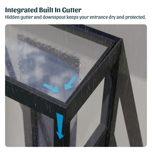- Built In Gutter: Integrated, Hidden gutter and downspout keep your entrance dry and protected .