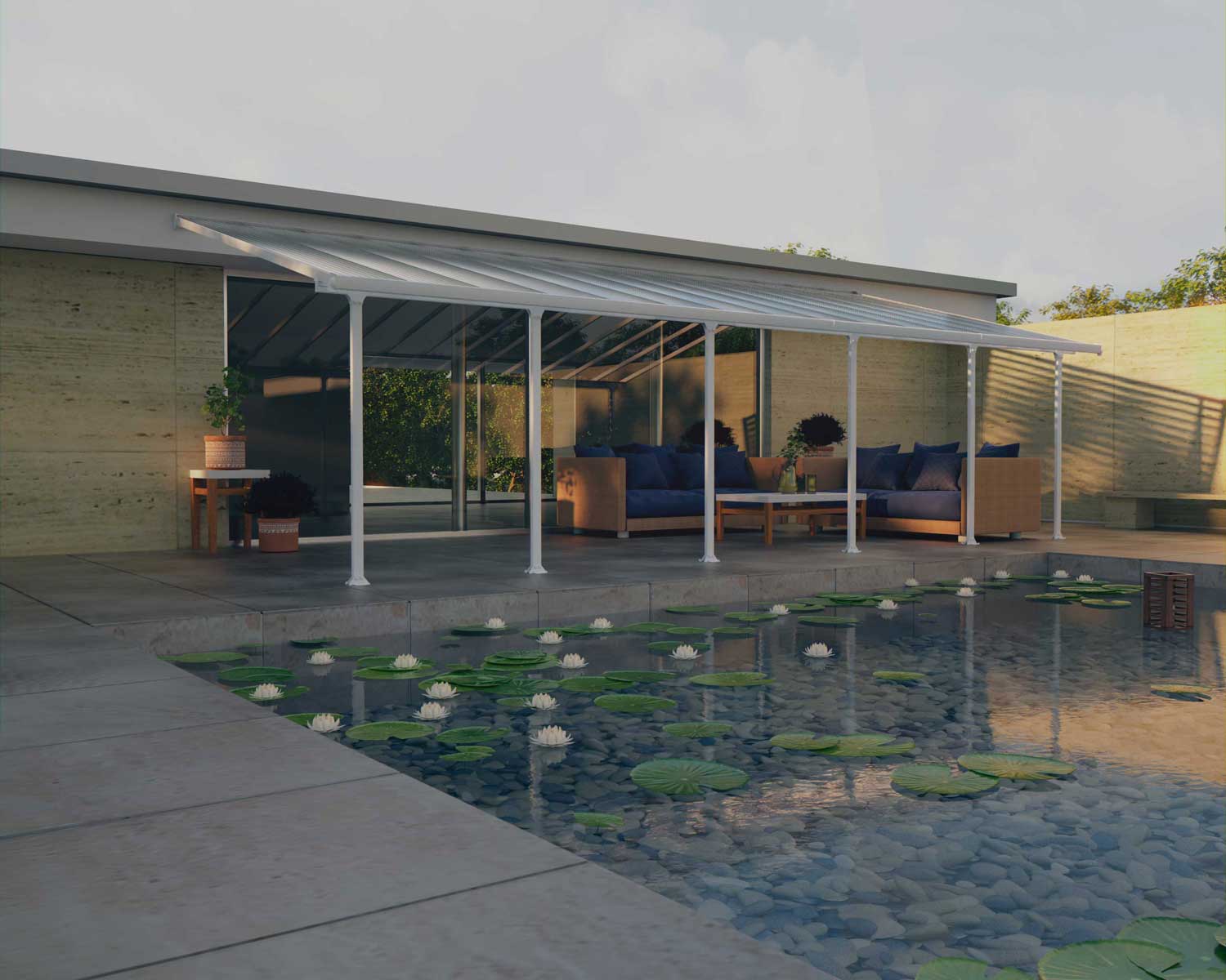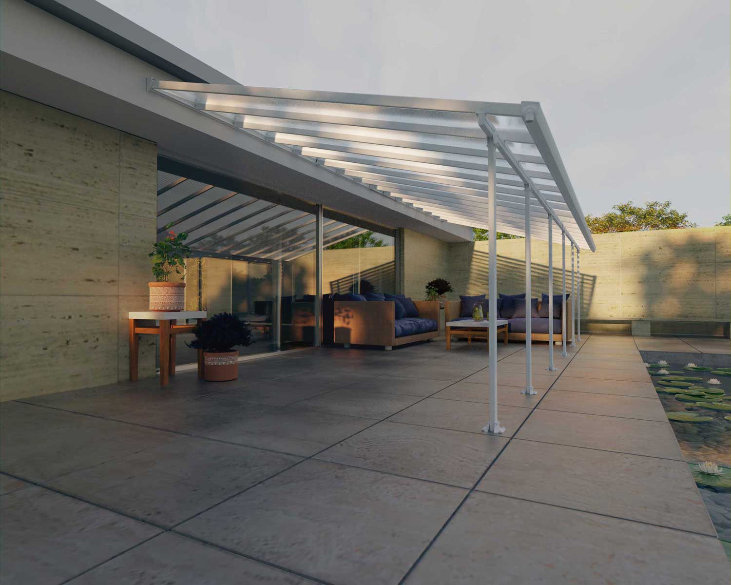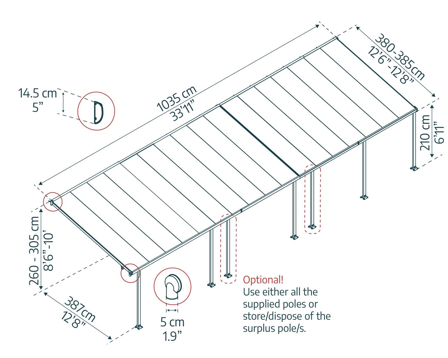 Enjoy warm days, cool nights, and everything in between under the extra-wide Feria Patio Cover. The Feria Patio Cover Kit is an attractive, maintenance-free roofing solution for various outdoor uses such as a patio cover, sun lounge, and carport. Protect your valuables from unpredictable weather and harmful UV rays with this high-performance structure. It features flexible positioning poles which enable you to set your required height at the wall connection, the distance from the house and between the poles at the front. It was designed to be simply assembled by 2 people, using the Click N’ Lock roofing system for safe and simple assembly, preventing leaks. It requires no experience, no special skills, and no special tools. The Feria Patio Awning provides your family with an elegant, beautifully crafted, sturdy addition to your outside living space that is sturdy and rust-free for many years to come.