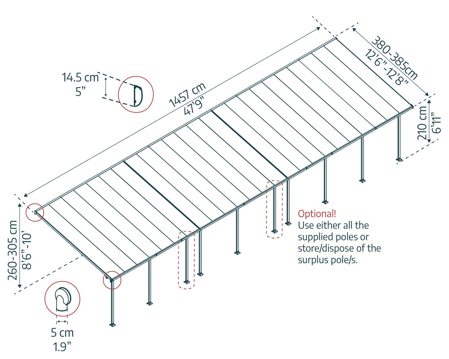 Enjoy warm days, cool nights, and everything in between under the extra-wide Feria Patio Cover. The Feria Patio Cover Kit is an attractive, maintenance-free roofing solution for various outdoor uses such as a patio cover, sun lounge, and carport. Protect your valuables from unpredictable weather and harmful UV rays with this high-performance structure. It features flexible positioning poles which enable you to set your required height at the wall connection, the distance from the house and between the poles at the front. It was designed to be simply assembled by 2 people, using the Click N’ Lock roofing system for safe and simple assembly, preventing leaks. It requires no experience, no special skills, and no special tools. The Feria Patio Awning provides your family with an elegant, beautifully crafted, sturdy addition to your outside living space that is sturdy and rust-free for many years to come.