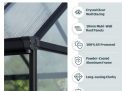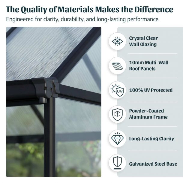 - Resilient Polycarbonate Panels: 10 mm multi-wall roof panels protect from strong sunlight exposure and extend your season by protecting plants from Fall frosts