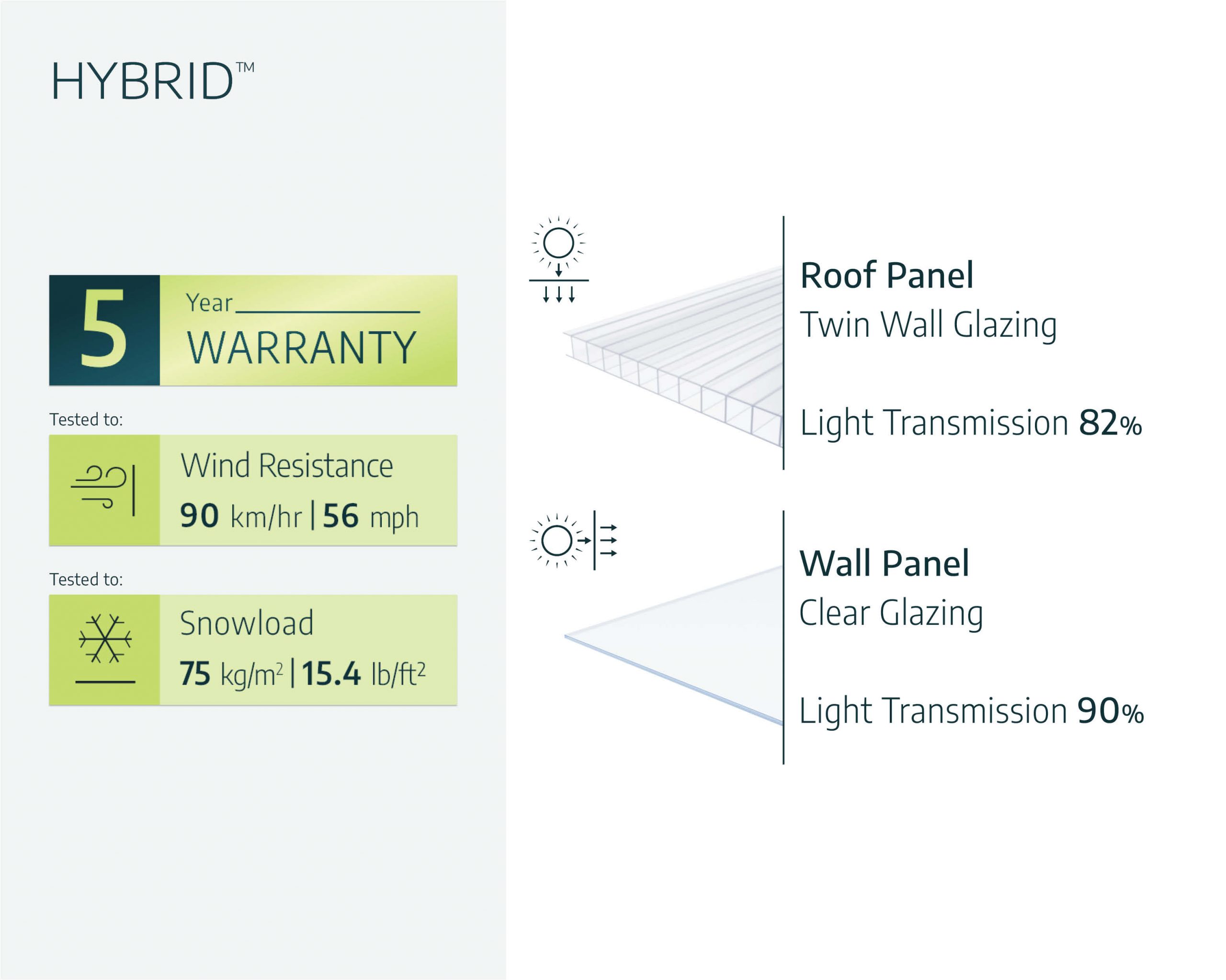 The Hybrid Greenhouse combines two types of polycarbonate panels to create a balanced environment for your plants. Polycarbonate is a virtually unbreakable polymer that provides the light transmission benefits of glass, but is lighter, stronger, and safer.