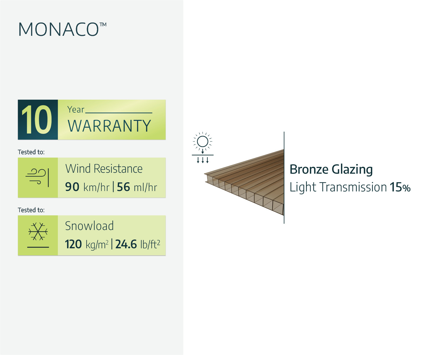 Virtually unbreakable 6 mm twin-wall polycarbonate roof panels are high impact and shatter resistant Treated grey glazing Transmits natural sunlight on overcast cloudy days yet provides sufficient shading Maintain their integrity, provide complete UV blockage, and are 100% UV protected; they do not discolor, fracture or become brittle over time ready to assemble pre-cut panels Sliding panels assembly system