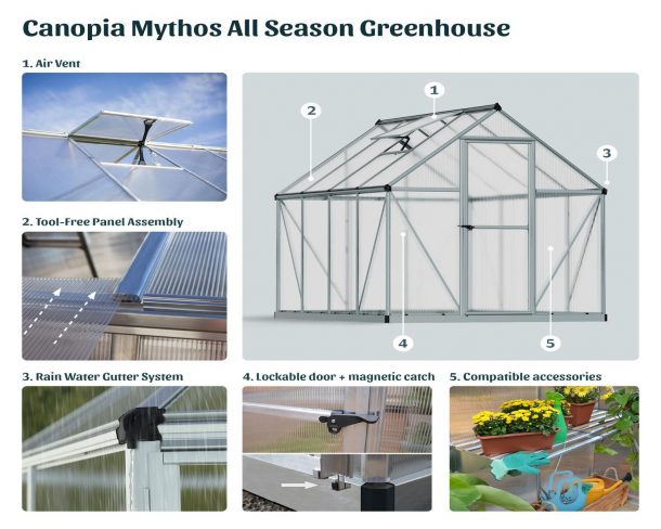 The Mythos Greenhouse helps you to maintain level temperatures anddiffuse sunlight for sensitive plants. It is a sleekly designed greenhouse, featuring virtually unbreakable, twin-wall polycarbonate panels, and a heavy-duty, rust-resistant aluminum frame. The Mythos greenhouse is elegant and practical, perfectly designed to fit smaller spaces and protect your plants from the elements so you can start growing earlier and continue growing later.