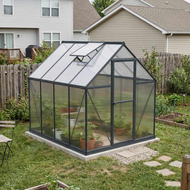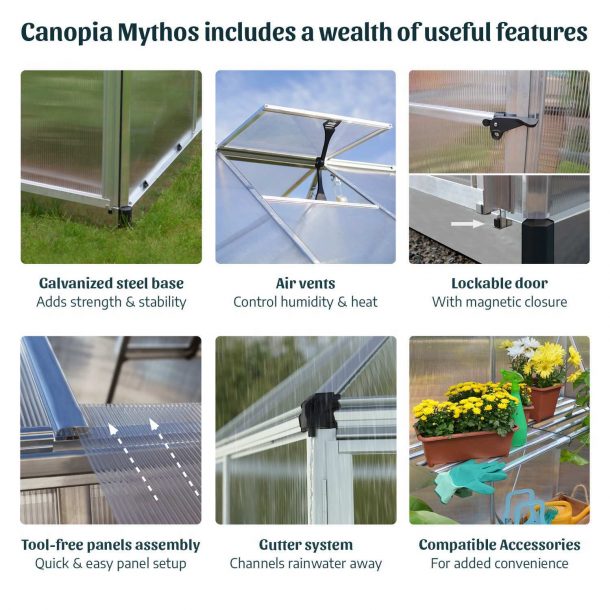 The Mythos Greenhouse helps you to maintain level temperatures and diffuse sunlight for sensitive plants. It is a sleekly designed greenhouse, featuring virtually unbreakable, twin–wall polycarbonate panels, and a heavy–duty, rust–resistant aluminum frame. The Mythos greenhouse is elegant and practical, perfectly designed to fit smaller spaces and protect your plants from the elements so you can start growing earlier and continue growing later.