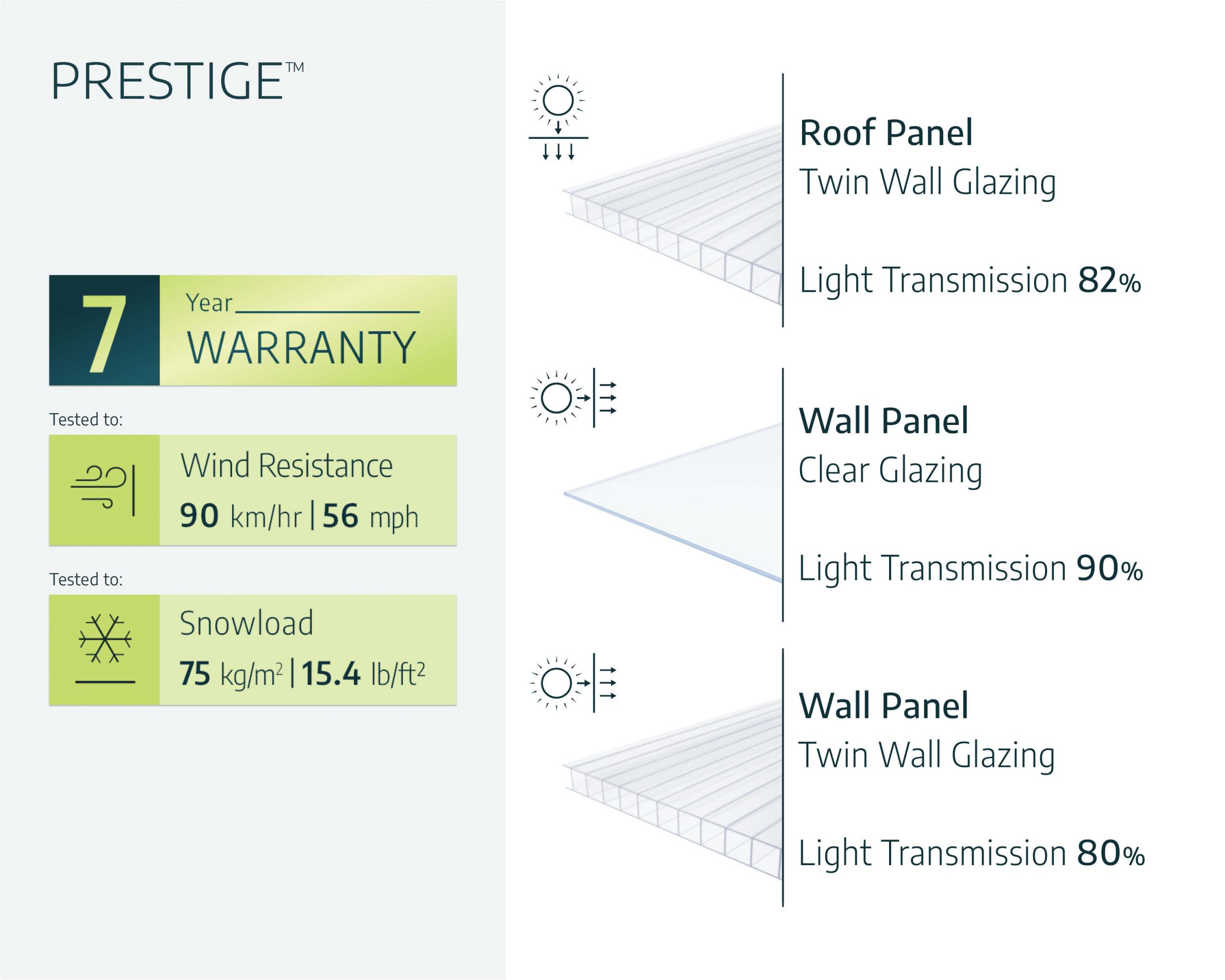 The emphasis on safety is evident from the heavy-duty frame to the extremely safe polycarbonate panels. The sturdy, weather resistant and UV-protected extruded resin frame with its aluminum roof profiles improves both full-insulation and durability. The polycarbonate side walls give you clear views while the 4mm twin-wall roof panels diffuse over 90% of sunlight for a soft, even light.
