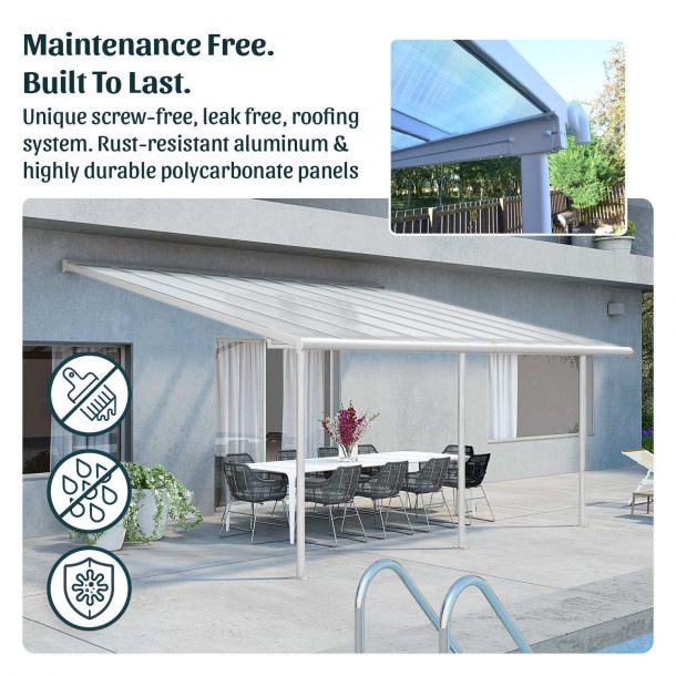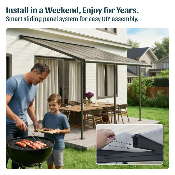 This maintenance-free roofing solution with clear glazing can be used as a patio cover, carport, sun lounge or spa cover, let your imagination run wild. Enjoy family get-togethers and cookouts without the weather ruining your fun. This high-performance structure was designed to be easily assembled by 2 people, using the Safe, quick and easy DIY assembly sliding roofing system that prevents water from penetrating the glazing. The Sierra Patio Cover Kit provides your family with an all-season space that is elegant, sturdy, and rust-free for years to come.