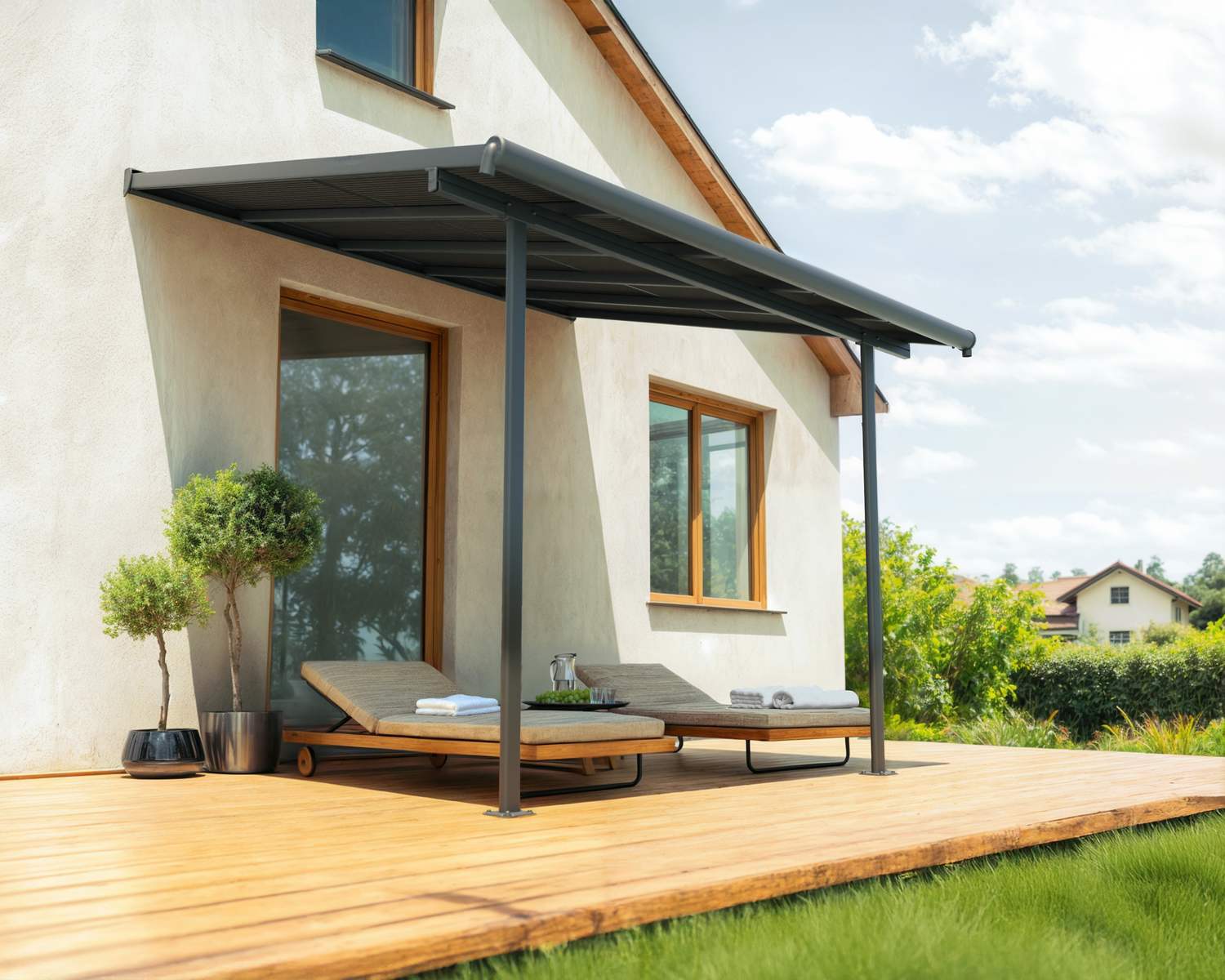 The Canopia Cabrio patio cover allows you to control sunlight and air, providing shade, ventilation, and complete rain protection. The Cabrio combines the durability of a polycarbonate patio cover with the functionality of a sliding roof, giving you a traditional patio roof with the flexibility of an awning. This allows you to enjoy the patio in all weather conditions, whether with friends or simply relaxing in a lounge chair. In summer, you can shield yourself from UV rays or let the smoke from a barbecue dissipate – open and close the sliding roof according to your needs. The sliding roof can be operated quickly and easily with a rod. With flexible positioning, you designate the height where it connects to your home, the distance from the house, and the space between the front poles. Though it has a flat roof, the Sierra Cabrio Porch Cover has integrated gutter heads that divert water, keeping you dry and your outside space usable no matter the weather.