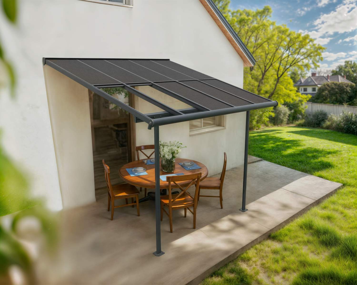 - Resilient Panels: The 6 mm matte opaque grey roof panels have full shade glazing with “Heat Block Technology”, preventing the sun’s rays from shining through making it cooler and protecting your outdoor space. Canopia polycarbonate panels are 100% UV protected, they do not turn yellow or become brittle over time.
