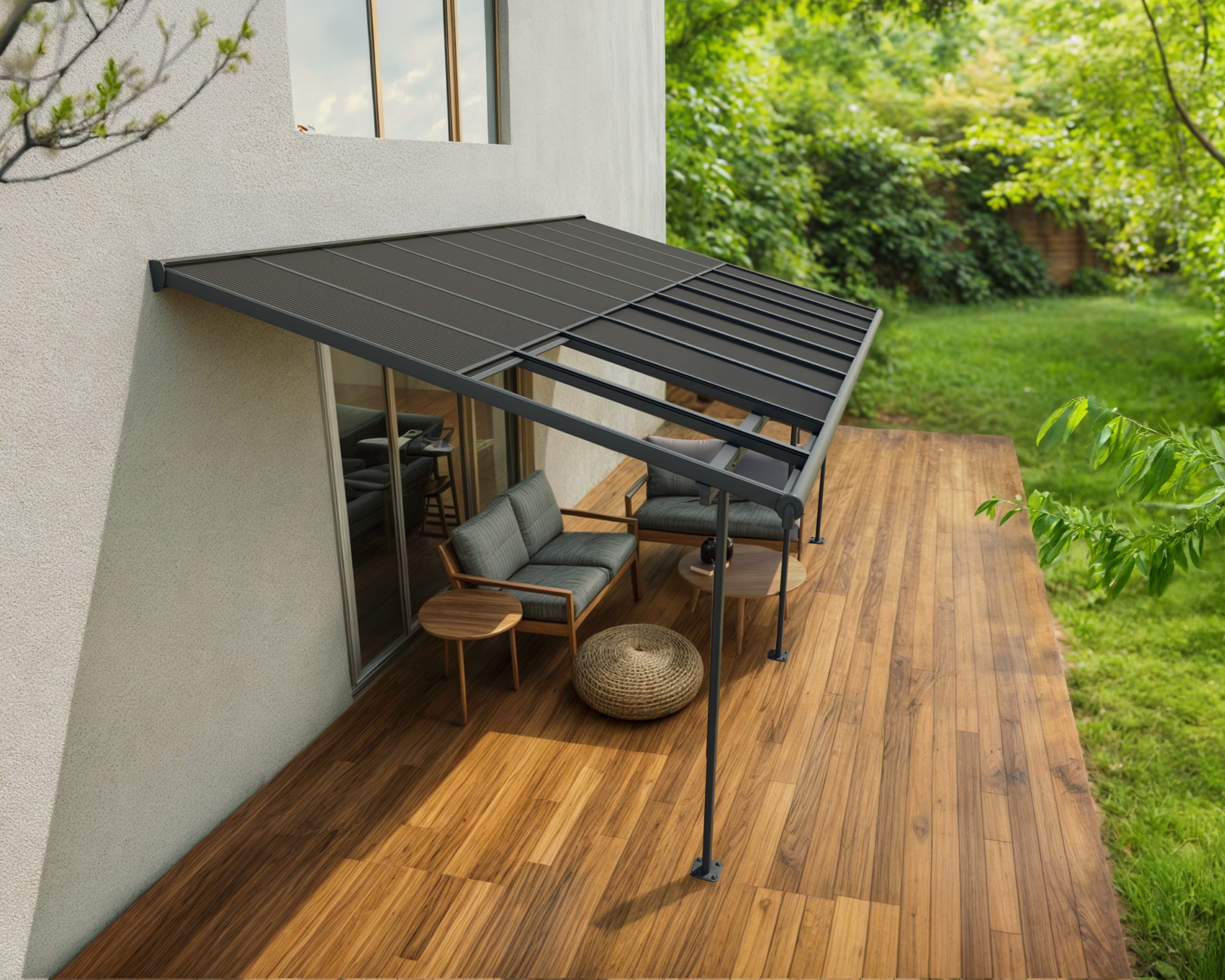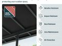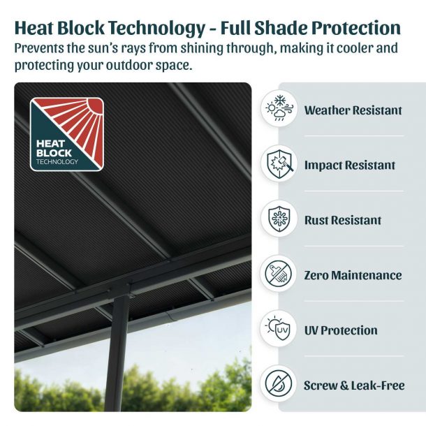 • Resilient Panels: The 6 mm matte opaque grey roof panels have full shade glazing with “Heat Block Technology”, preventing the sun’s rays from shining through making it cooler and protecting your outdoor space. Canopia polycarbonate panels are 100% UV protected, they do not turn yellow or become brittle over time.