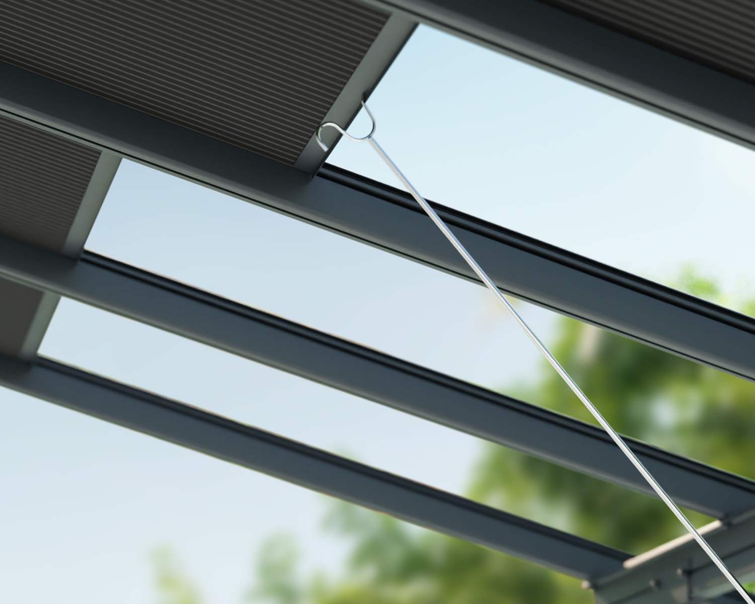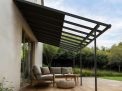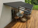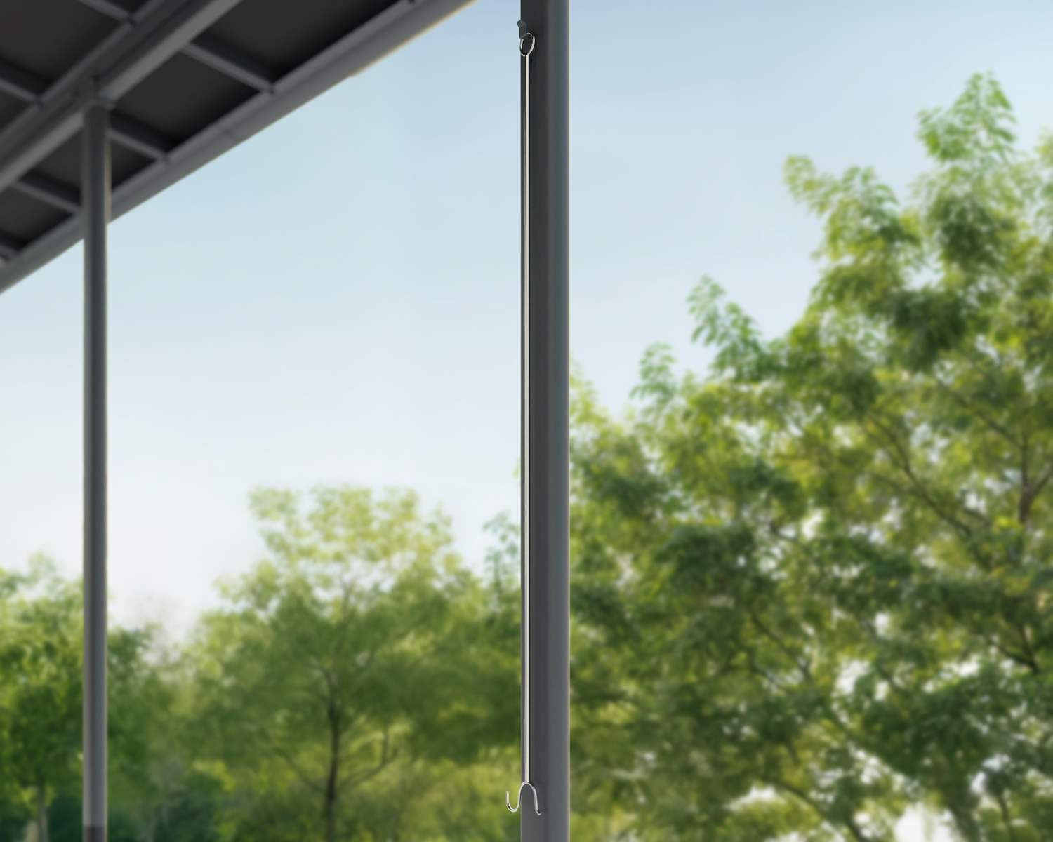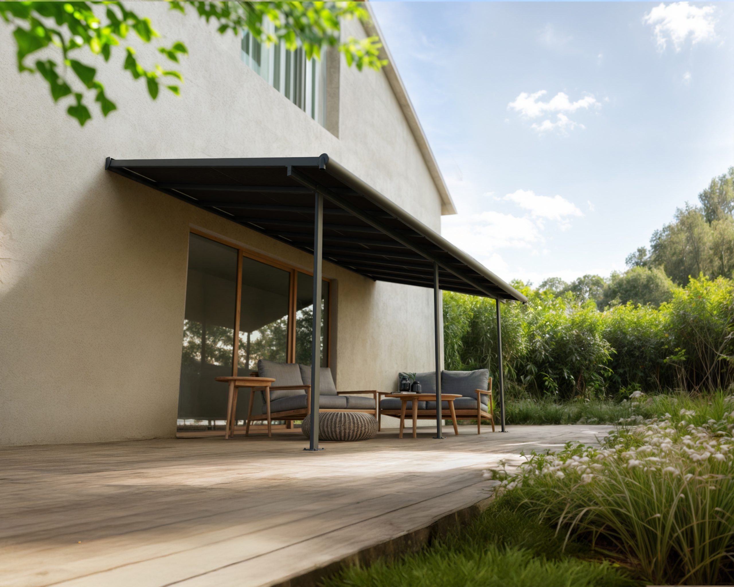 The Canopia Cabrio patio cover allows you to control sunlight and air, providing shade, ventilation, and complete rain protection. The Cabrio combines the durability of a polycarbonate patio cover with the functionality of a sliding roof, giving you a traditional patio roof with the flexibility of an awning. This allows you to enjoy the patio in all weather conditions, whether with friends or simply relaxing in a lounge chair. In summer, you can shield yourself from UV rays or let the smoke from a barbecue dissipate – open and close the sliding roof according to your needs. The sliding roof can be operated quickly and easily with a rod. With flexible positioning, you designate the height where it connects to your home, the distance from the house, and the space between the front poles. Though it has a flat roof, the Sierra Cabrio Porch Cover has integrated gutter heads that divert water, keeping you dry and your outside space usable no matter the weather.