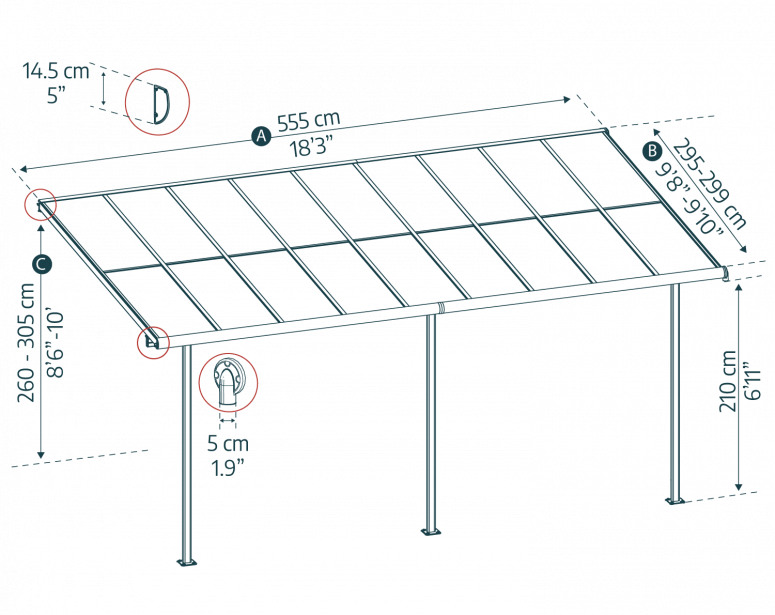 | B | Width | 295-299cm | 9'8"-9'10"ft |