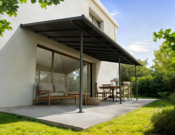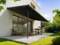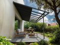 The Canopia Cabrio patio cover allows you to control sunlight and air, providing shade, ventilation, and complete rain protection. The Cabrio combines the durability of a polycarbonate patio cover with the functionality of a sliding roof, giving you a traditional patio roof with the flexibility of an awning. This allows you to enjoy the patio in all weather conditions, whether with friends or simply relaxing in a lounge chair. In summer, you can shield yourself from UV rays or let the smoke from a barbecue dissipate – open and close the sliding roof according to your needs. The sliding roof can be operated quickly and easily with a rod. With flexible positioning, you designate the height where it connects to your home, the distance from the house, and the space between the front poles. Though it has a flat roof, the Sierra Cabrio Porch Cover has integrated gutter heads that divert water, keeping you dry and your outside space usable no matter the weather