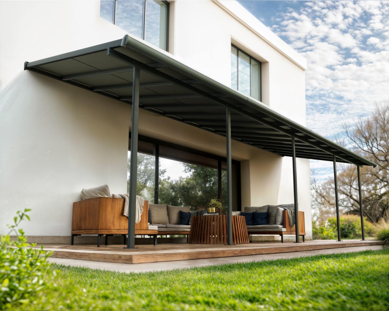 The Canopia Cabrio patio cover allows you to control sunlight and air, providing shade, ventilation, and complete rain protection. The Cabrio combines the durability of a polycarbonate patio cover with the functionality of a sliding roof, giving you a traditional patio roof with the flexibility of an awning. This allows you to enjoy the patio in all weather conditions, whether with friends or simply relaxing in a lounge chair. In summer, you can shield yourself from UV rays or let the smoke from a barbecue dissipate – open and close the sliding roof according to your needs. The sliding roof can be operated quickly and easily with a rod. With flexible positioning, you designate the height where it connects to your home, the distance from the house, and the space between the front poles. Though it has a flat roof, the Sierra Cabrio Porch Cover has integrated gutter heads that divert water, keeping you dry and your outside space usable no matter the weather.
