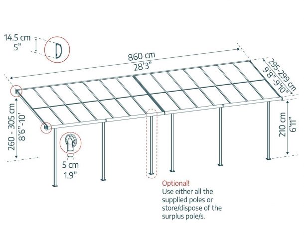 - Flexible and Adjustable: Choose height and distance from wall and between poles for a customised experience for your patio or porch. Foot pad kit included. Please note that a solid level surface and wall support is required.