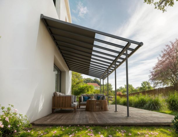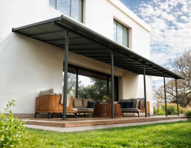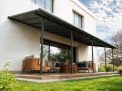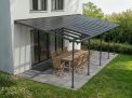 The Canopia Cabrio patio cover allows you to control sunlight and air, providing shade, ventilation, and complete rain protection. The Cabrio combines the durability of a polycarbonate patio cover with the functionality of a sliding roof, giving you a traditional patio roof with the flexibility of an awning. This allows you to enjoy the patio in all weather conditions, whether with friends or simply relaxing in a lounge chair. In summer, you can shield yourself from UV rays or let the smoke from a barbecue dissipate – open and close the sliding roof according to your needs. The sliding roof can be operated quickly and easily with a rod. With flexible positioning, you designate the height where it connects to your home, the distance from the house, and the space between the front poles. Though it has a flat roof, the Sierra Cabrio Porch Cover has integrated gutter heads that divert water, keeping you dry and your outside space usable no matter the weather.