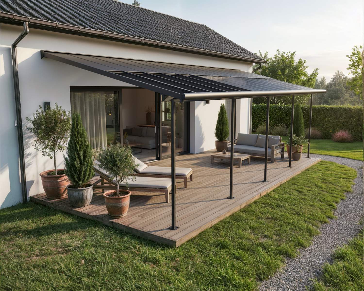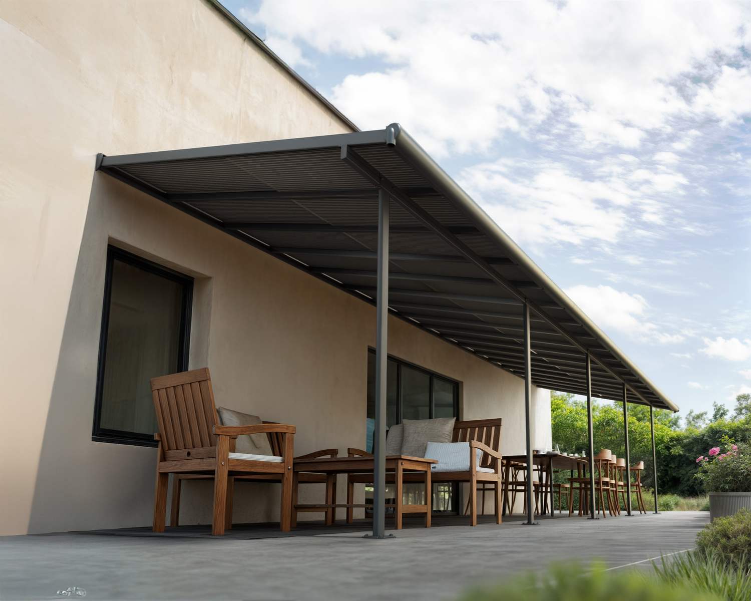 The Canopia Cabrio patio cover allows you to control sunlight and air, providing shade, ventilation, and complete rain protection. The Cabrio combines the durability of a polycarbonate patio cover with the functionality of a sliding roof, giving you a traditional patio roof with the flexibility of an awning. This allows you to enjoy the patio in all weather conditions, whether with friends or simply relaxing in a lounge chair. In summer, you can shield yourself from UV rays or let the smoke from a barbecue dissipate – open and close the sliding roof according to your needs. The sliding roof can be operated quickly and easily with a rod. With flexible positioning, you designate the height where it connects to your home, the distance from the house, and the space between the front poles. Though it has a flat roof, the Sierra Cabrio Porch Cover has integrated gutter heads that divert water, keeping you dry and your outside space usable no matter the weather.