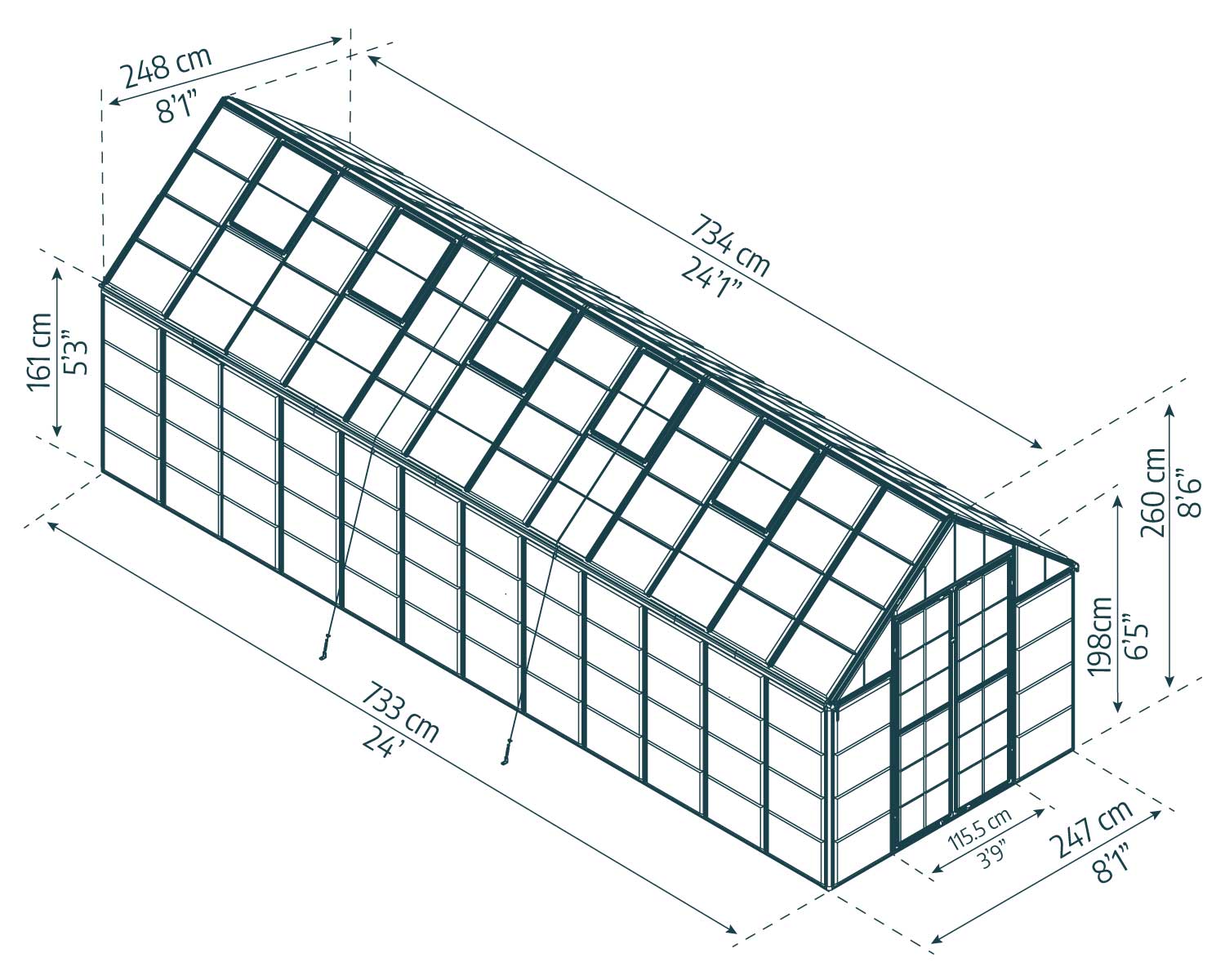 The crystal-clear polycarbonate panels provide over 90% light transmission, will not yellow over time, are virtually unbreakable, and block 100% of harmful UV rays. The 8’ series features two extra-tall doors for easy entry and an 8’ wide floor for lots of room to move. It also has two (2) adjustable roof vents to provide ventilation and temperature control.