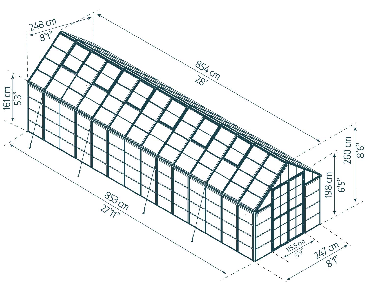 The crystal-clear polycarbonate panels provide over 90% light transmission, will not yellow over time, are virtually unbreakable, and block 100% of harmful UV rays. The 8’ series features two extra-tall doors for easy entry and an 8’ wide floor for lots of room to move. It also has two (2) adjustable roof vents to provide ventilation and temperature control.