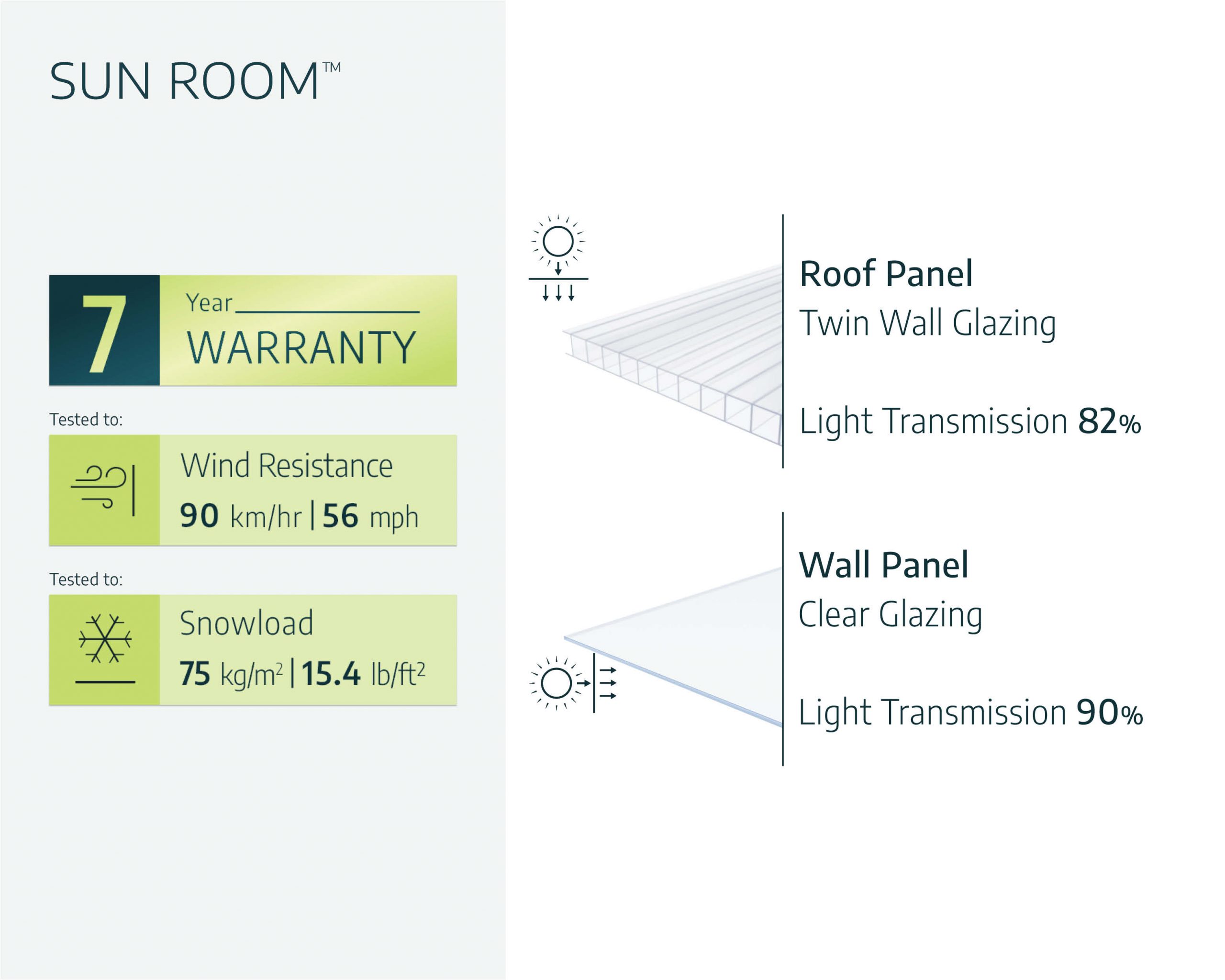 - Virtually unbreakable, twin-wall polycarbonate roof panels, filter the sunlight and block up to 100% of the harmful UV rays